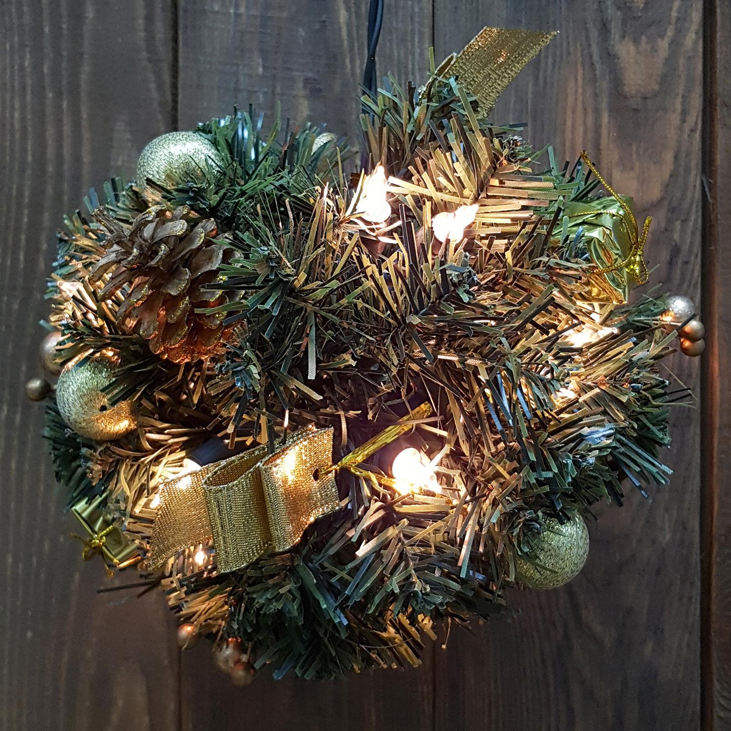 - Декор Шар еловый d18см зеленый с огнями 20 ламп и золотыми шишками кабель зеленый