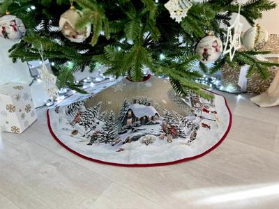 Каждая деталь «Кэрол» словно шепчет о зимних чудесах: заснеженные домики, радостные снеговики, укутанные в гирлянды деревья и легкие, кружащиеся снежинки, словно только что приземлившиеся с небес. Созданная в лучших европейских традициях, эта манжета — настоящий гобеленовый шедевр, который привнесет в ваш интерьер изысканность и неповторимое ощущение сказки. Она не только искусно скроет основание ели, но и станет идеальным фоном для самых долгожданных подарков, ожидающих своего часа.