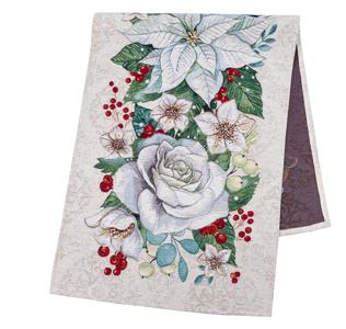 Представьте, как ваш дом наполняется атмосферой изысканности и утонченного праздника. На столе расстилается не просто дорожка, а настоящий букет, сотканный из зимних грез – нежных роз, пуансеттий и ярких ягод, словно только что припорошенных легким морозцем.