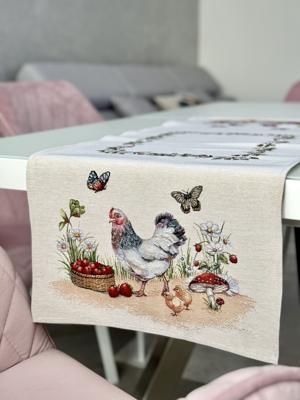 Эта гобеленовая дорожка – воплощение теплоты и натуральности, призванное создать ощущение летнего отдыха в деревне, полного солнечного света и гармонии. Ее центральный фон, светлый и естественный, служит идеальным холстом для очаровательной сценки: гордая курица с пушистыми цыплятами, корзина, полная спелой клубники, милые грибочки, порхающие бабочки и россыпь полевых цветов. Верхний бордюр украшает нежный венок из маргариток и ягод, добавляя композиции особую прелесть. А её двусторонний дизайн – это настоящий подарок, позволяющий менять настроение стола по вашему желанию!