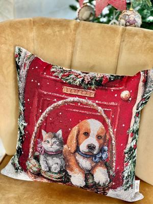 Представьте: за окном морозный узор, а в вашем доме царит атмосфера искренней радости и предвкушения самого доброго праздника. Из нарядно украшенной корзины на вас смотрят самые милые создания – пушистый котенок и преданный щенок, словно сами они являются лучшим рождественским подарком. Это не просто декоративная подушка – это осязаемая нежность, прибывшая прямиком из европейских мастерских, чтобы наполнить ваш семейный очаг искрящейся любовью и добрым волшебством.