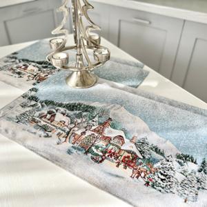 Эта трикотажная салфетка – настоящее воплощение зимней идиллии, призванное создать атмосферу горного курорта прямо у вас дома. Ее центральное полотно украшено завораживающим пейзажем: величественные горные вершины, укрытые искрящимся снегом, и живописная деревушка с уютными домиками, из труб которых поднимается дымок. Общий тон в холодных, свежих оттенках синего и белого создает ощущение чистоты и морозной свежести. Мягкий трикотаж приятно ощущается на ощупь, добавляя тепла и уюта.