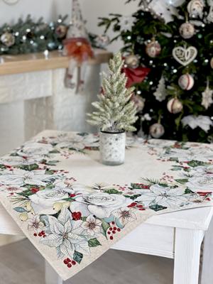 Эта великолепная гобеленовая скатерть с серебристым люрексом — это настоящий шедевр европейского искусства декора. По ее периметру расцветает пышный венок из нежных роз, белоснежных пуансеттий, алых ягод и хвойных веточек, припорошенных инеем. Серебристый люрекс, тонко вплетенный в ткань, создает эффект деликатного мерцания, словно на цветах осели хрустальные снежинки. Это придает скатерти особую премиальность и глубину, заставляя узор буквально оживать под светом свечей или праздничных гирлянд. Мягкость гобелена и изысканный цветочный мотив превратят любой ужин в незабываемое событие, наполненное элегантностью, теплом и ощущением волшебства.