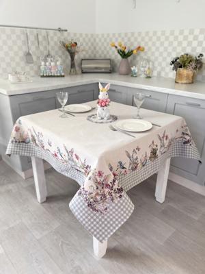Эта скатерть – часть нашей эксклюзивной европейской коллекции, созданной в мастерских, где искусство гобелена сочетается с тончайшим чувством прекрасного. Каждый пасхальный зайчик, каждый распустившийся бутон и каждый утонченный узор на ее кромке – это дань безупречному вкусу и утонченности. Забавные зайчики, словно живые, резвятся среди нежных цветов и зелени, притягивая взгляд и обещая самые теплые и душевные моменты за столом. Центральное поле скатерти, украшенное деликатным узором, создает ощущение свежести и легкости, гармонично дополняя общий ансамбль.