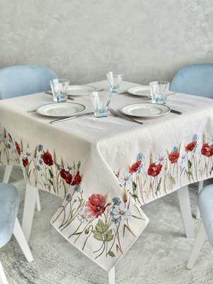 Эта скатерть – часть нашей эксклюзивной коллекции, привезенной напрямую из европейских мастерских, где искусство гобелена возведено в ранг истинного творчества. Каждый цветок, каждая травинка, каждый взмах бабочки на ее кромке – это дань безупречному вкусу и утонченности. Изящные маки, васильки и ромашки, словно живые, рассыпаны по краю светлого полотна, притягивая взгляд и обещая самые теплые и душевные моменты за столом.